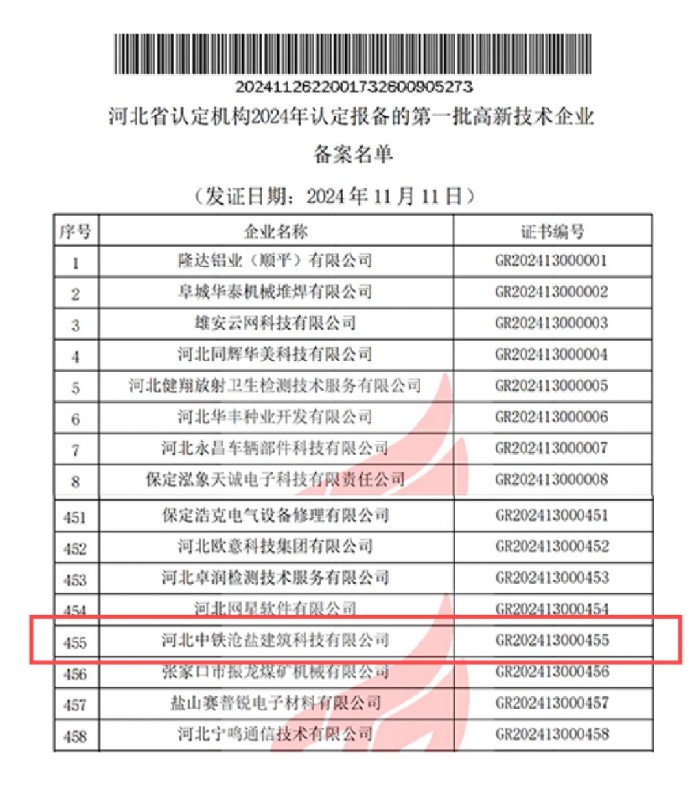 近日,河北中鐵滄鹽建筑科技有限公司順利通過(guò)了國(guó)家高新技術(shù)企業(yè)復(fù)審,并于2024年11月27日取得了新版“國(guó)家高新技術(shù)企業(yè)”證書(shū)。