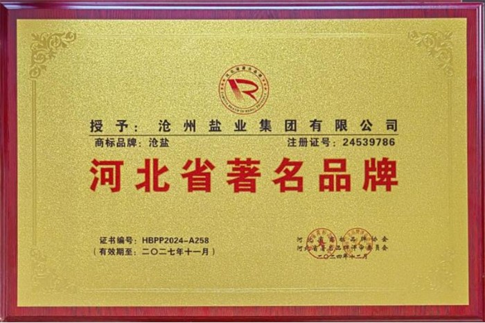 近日,河北省商標(biāo)品牌協(xié)會(huì)組織開展的2024年度“河北省著名、知名、優(yōu)秀品牌”評(píng)選結(jié)果正式揭曉,經(jīng)過嚴(yán)格的評(píng)審和篩選,滄州鹽業(yè)集團(tuán)有限公司注冊(cè)號(hào)為24539786的“滄鹽”牌商標(biāo)被評(píng)定為“河北省著名品牌”,滄州鹽業(yè)集團(tuán)有限公司被授予“河北省商標(biāo)品牌協(xié)會(huì)副會(huì)長(zhǎng)單位”。