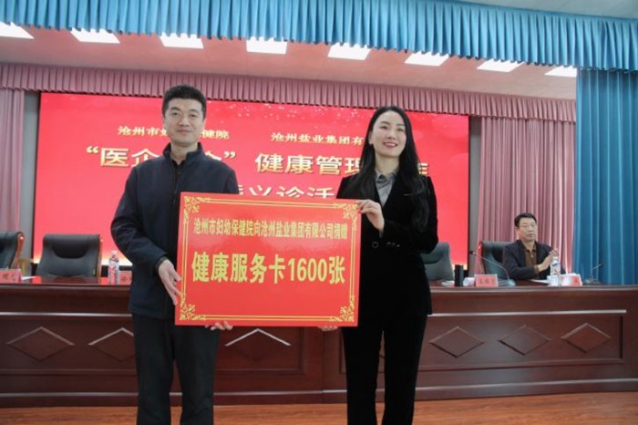 在參會人員的共同見證下,張立莊、徐聞鉑分別代表滄鹽集團(tuán)、滄州市婦幼保健院簽訂了“醫(yī)企融合”健康管理合作意向書。張立莊、狄彬、徐聞鉑、崔國光共同為“醫(yī)企融合”健康管理合作單位揭牌。崔國芳代表滄鹽集團(tuán)現(xiàn)場接受了滄州市婦幼保健院捐贈的1600余張健康服務(wù)卡。